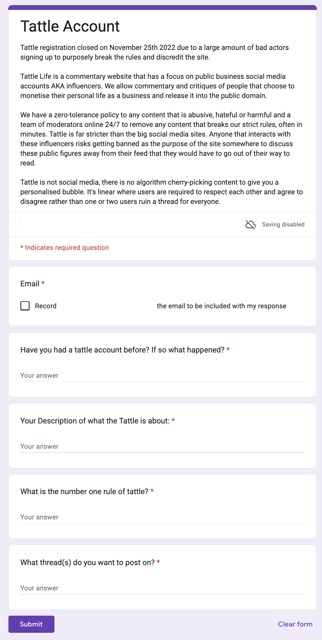From a PR and legal perspective, this is clever in a grim sort of way. By pushing registration through a third-party form and asking for “definitions” of what Tattle is, they can argue they’re vetting users while in reality collecting nothing of substance. There’s no ID check, no verification, no accountability.